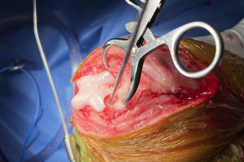 An incision is made into the joint capsule. This procedure is called an arthrotomy. The joint is lavaged, and the internal structures are examined. Remnants of the damaged cranial cruciate ligament are removed as it serves no purpose after the joint has been stabilized, and the remnants could create a future source of pain. The medial and lateral menisci are cartilage pads that help to transfer weight from the femur to the tibia. These cartilages are examined. If damaged, then the damaged portion is removed (partial meniscectomy), or the entire meniscus may be removed (complete meniscectomy). The joint is lavaged and the joint capsule is sutured closed with a dissolvable suture.