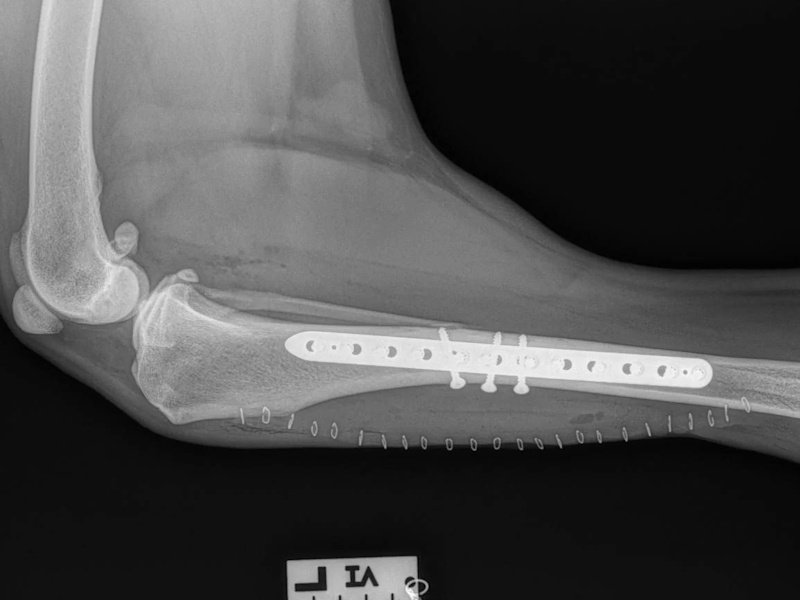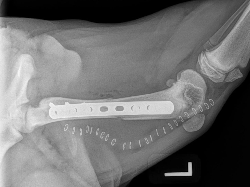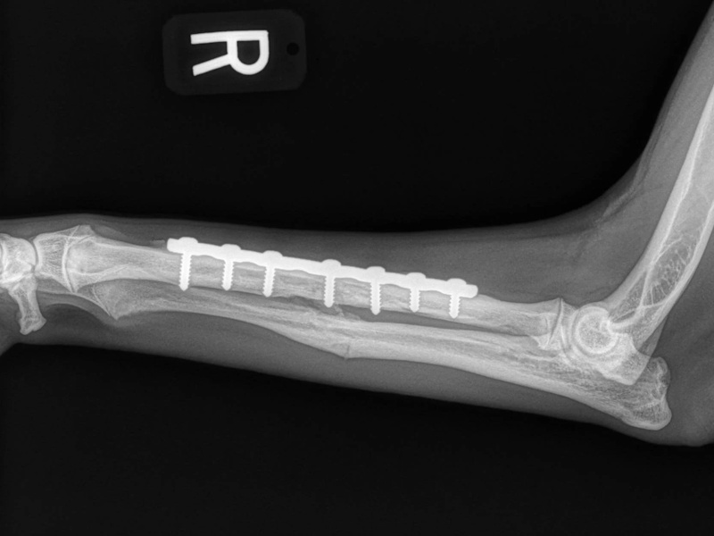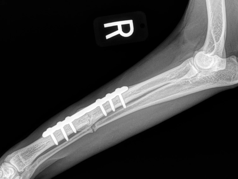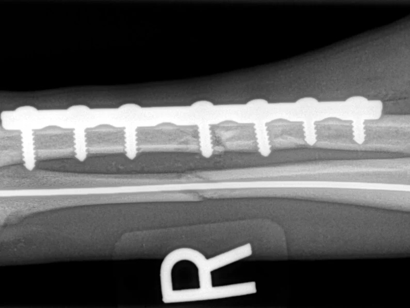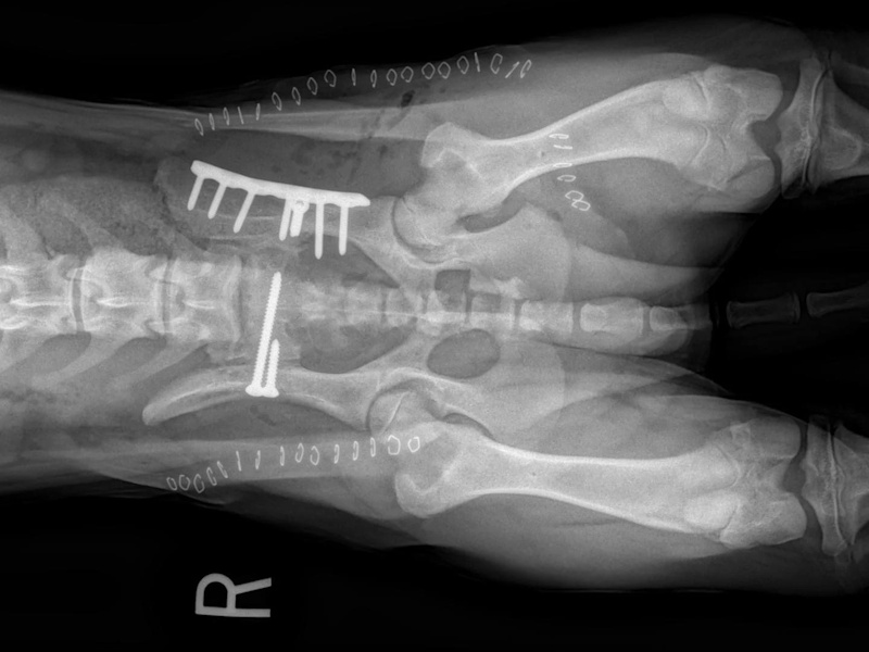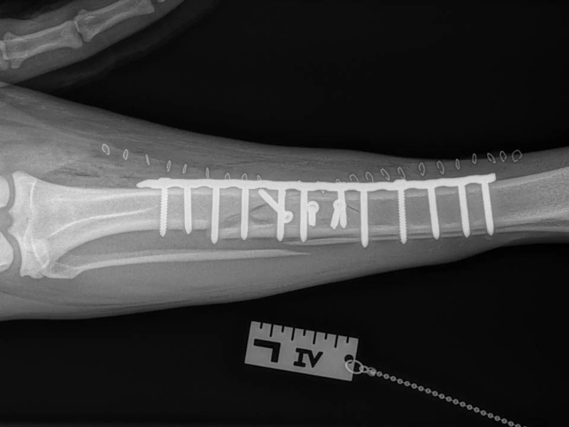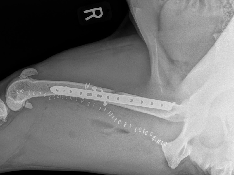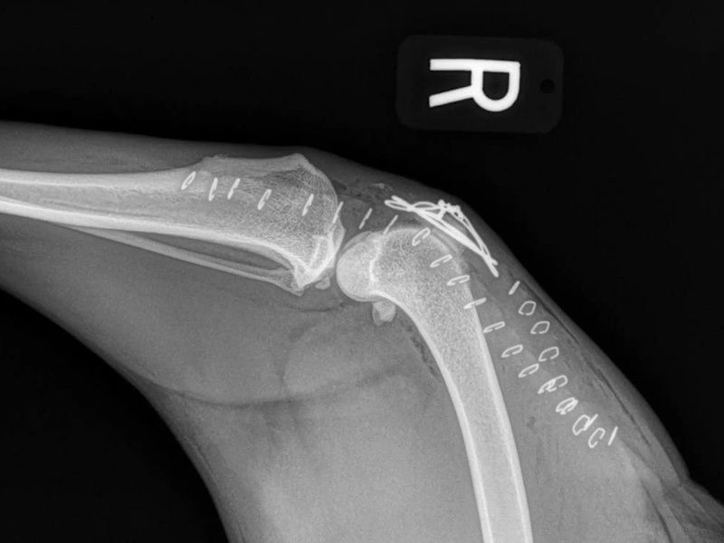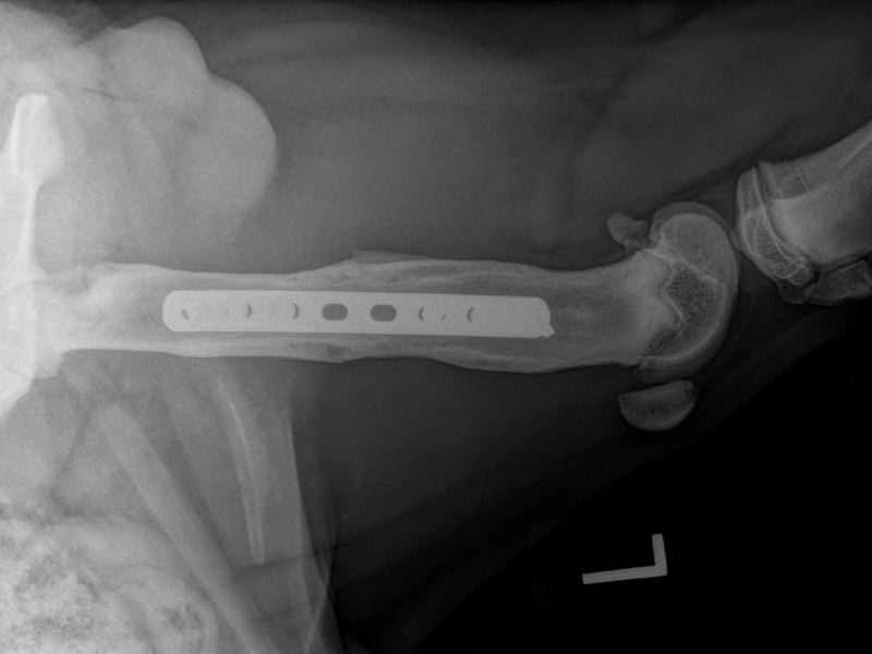 At six weeks after surgery, we will take radiographs to confirm the healing process is progressing as expected. The patient will then be able to move around within the confines of the house without being kept in a crate. Outside, they will still need to be kept on a leash for an additional 6 weeks. At 12 weeks after surgery, a final recheck exam and series of radiographs will be obtained. The patients will be cleared at this visit to resume activity off-leash.