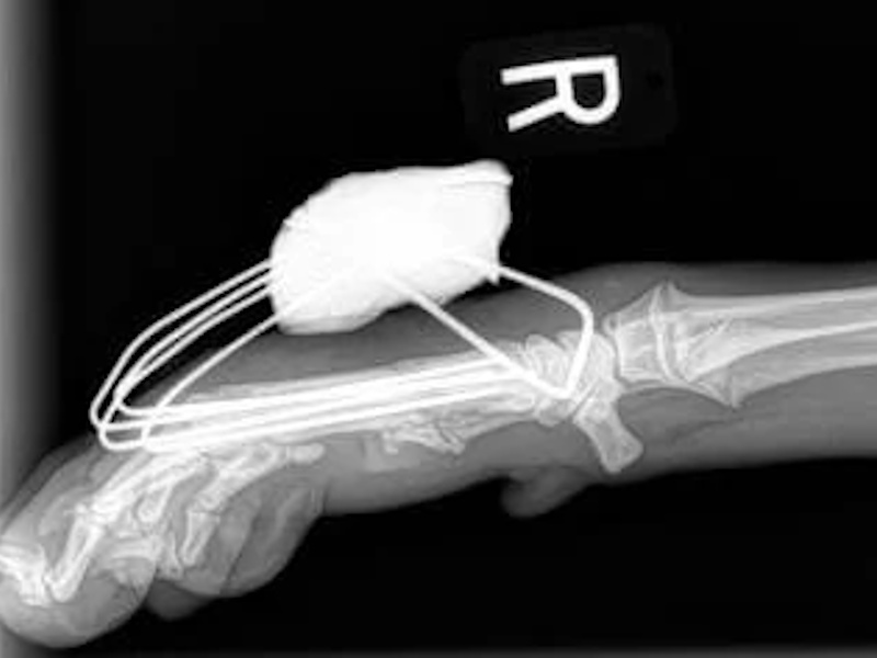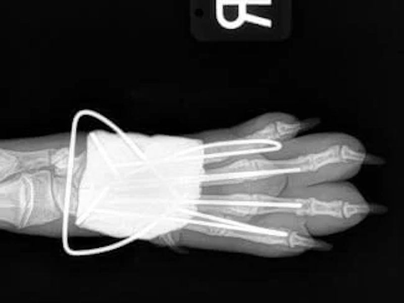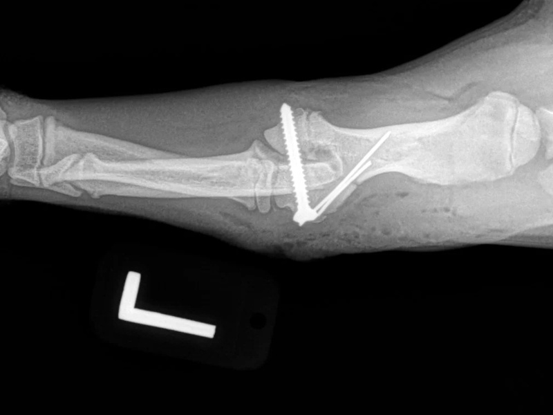 While the patient is still anesthetized, the patient is taken into radiology for post-surgery radiographs (X-rays). The radiographs are assessed to ensure the apparatus FASTak screw and toggle are appropriately positioned.