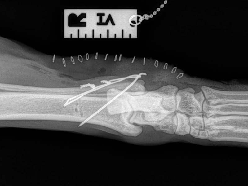 While the patient is still anesthetized, the patient is taken into radiology for post-surgery radiographs (X-rays). The radiographs are assessed to measure the new tibial plateau angle. We are aiming for 5-6 degrees relative to the long axis of the tibia. The apparatus (plate and screws) are assessed for size and appropriate position.