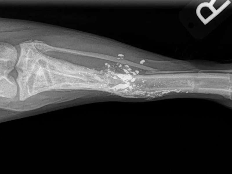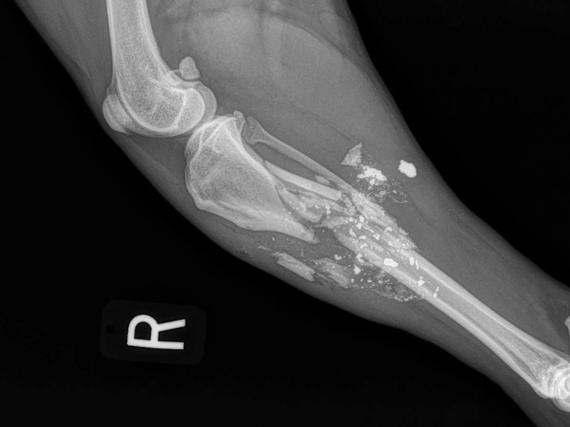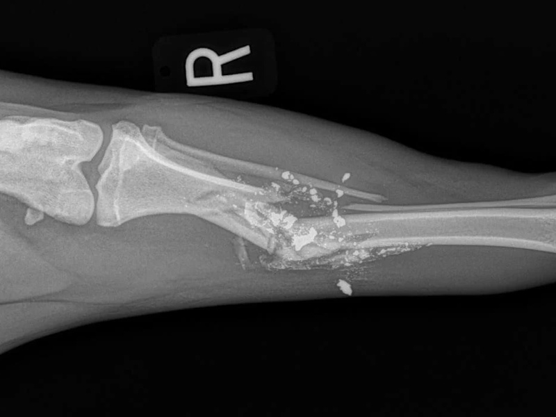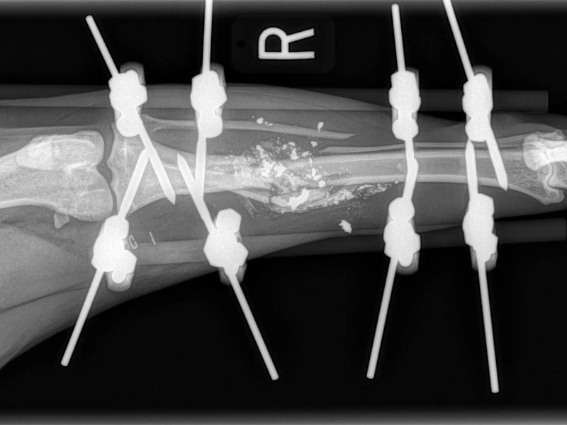 After the post-surgical radiographs have been reviewed by the surgeon, the patient is moved through to recovery. The patient's leg is cleaned and a light padded bandage is applied to the limb to help prevent post-surgical swelling.